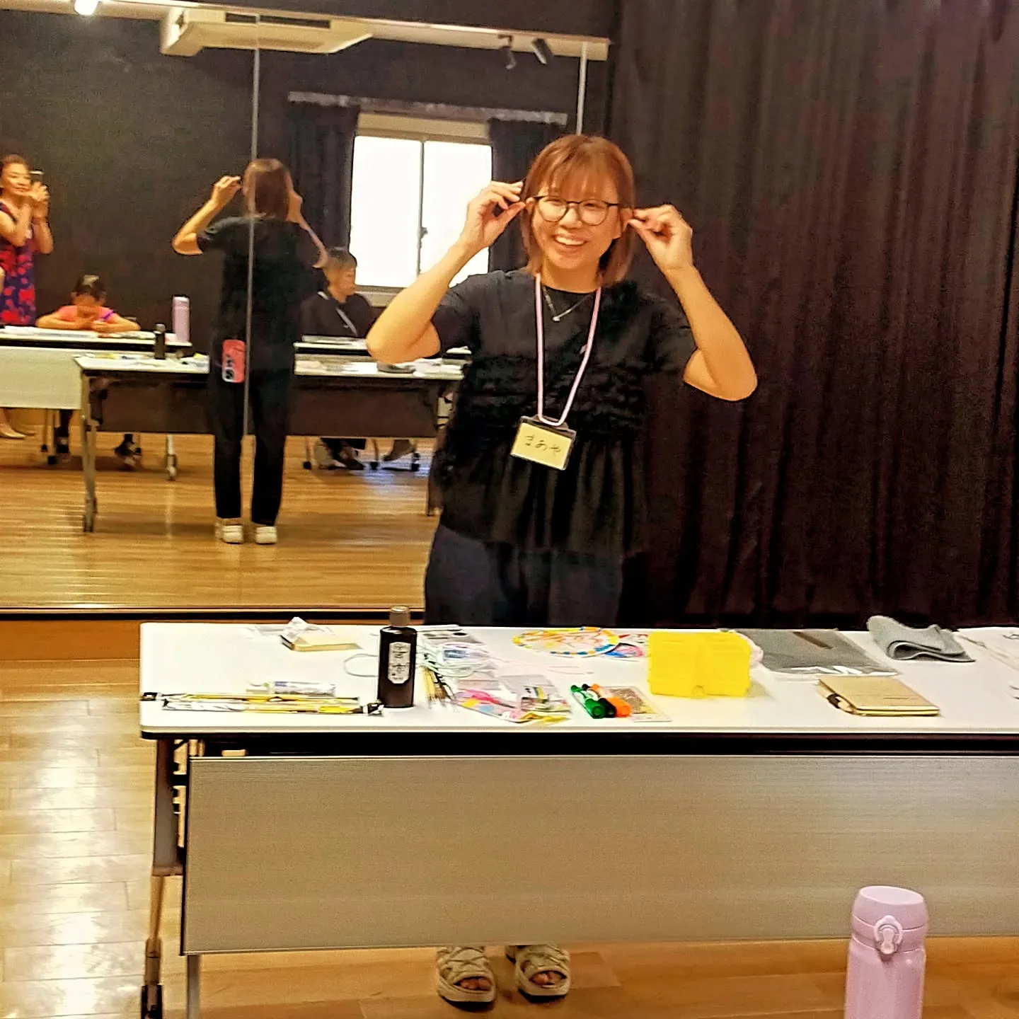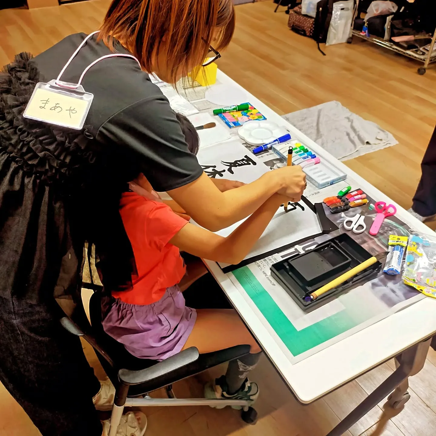 等の声を集めての「書道イベント」は、小さなうちわへ文字や絵を描いたり、キラキラなシールを貼ったりと楽しい制作風景でした。