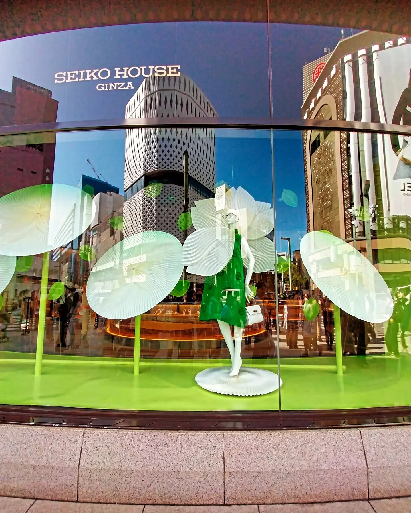 【春色に染まる銀座の街角から】春の銀座。陽光がまぶしく、風がやわらかく、街全体が軽やかに目覚める季節。ふと足を止めたのは、銀座和光のショウウィンドウ。鮮やかなグリーンに包まれたドレスと繊細…