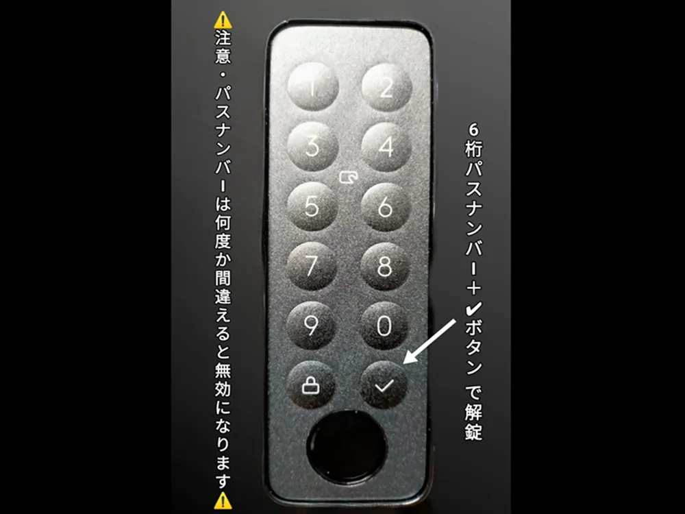 ドア外側の黒いキーパッドでパスナンバー6桁と✔を押す。