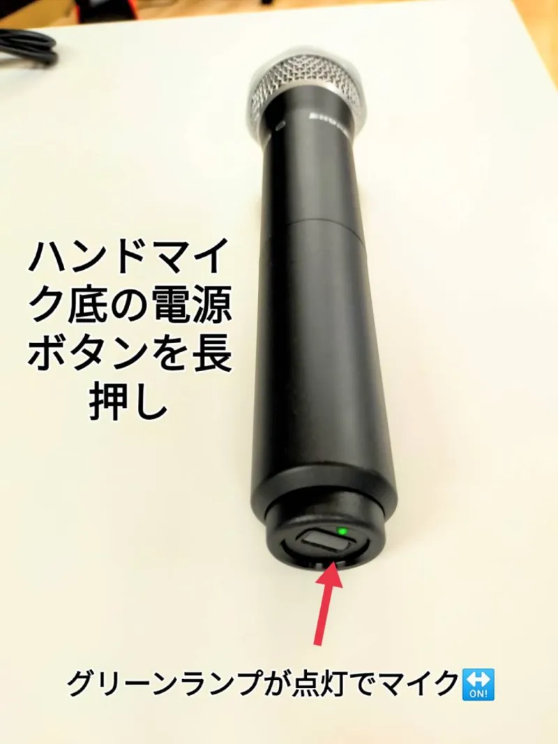 ④ハンドマイク底の電源を長押し(緑色のランプが点灯)