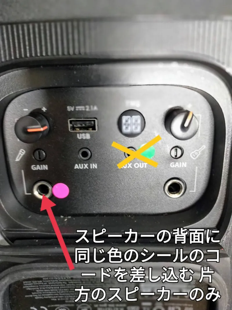 電源を入れたスピーカー裏のゴム蓋を開け、同じピンクの丸いシールが貼ってある箇所に挿す。