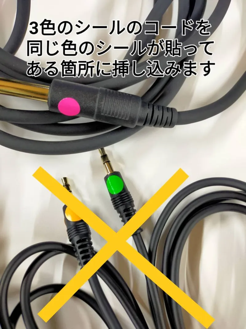 ③マイクステーションにさしてあるケーブルの内、ピンクの丸いシールが貼ってあるジャックを、