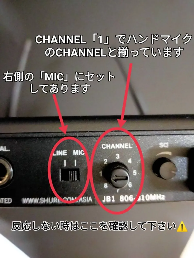 ※マイクが上手く作動しない場合は、本体裏のチャンネルとスイッチが、正しい位置にあるかご確認ください。下の写真参照