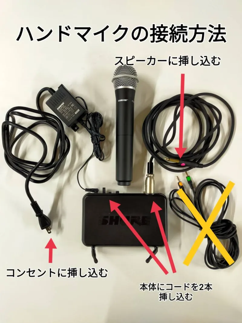 Shure ハンドマイク………スタジオ内に置いてある写真付き「マイクの接続方法」か下記の「マイクとスピーカーの接続方法」の写真参照
