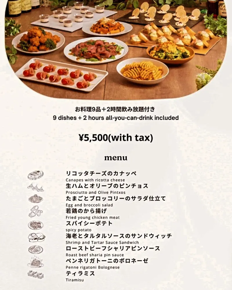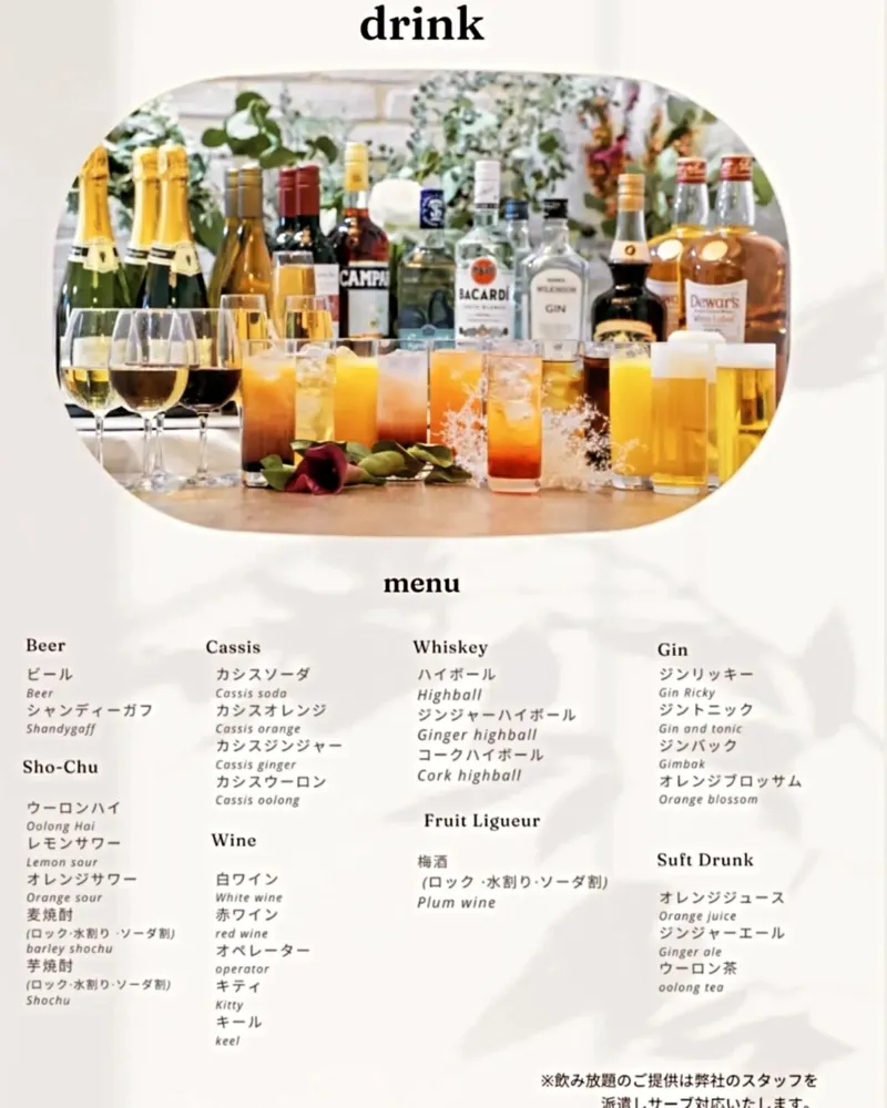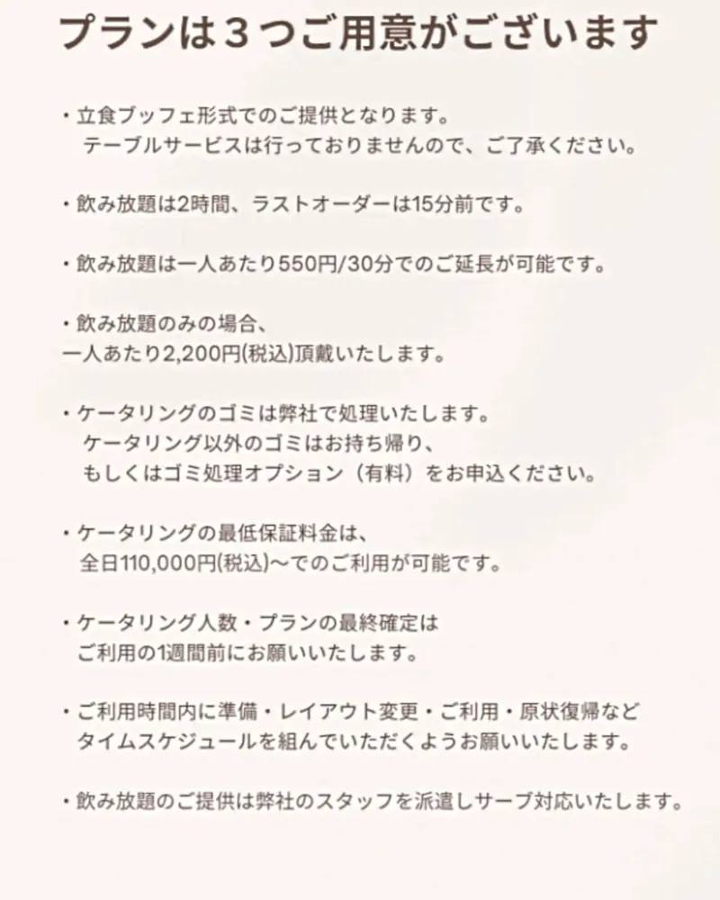 3種類の飲み放題付プラン・パーティー用ケイタリングサービスがございます。
