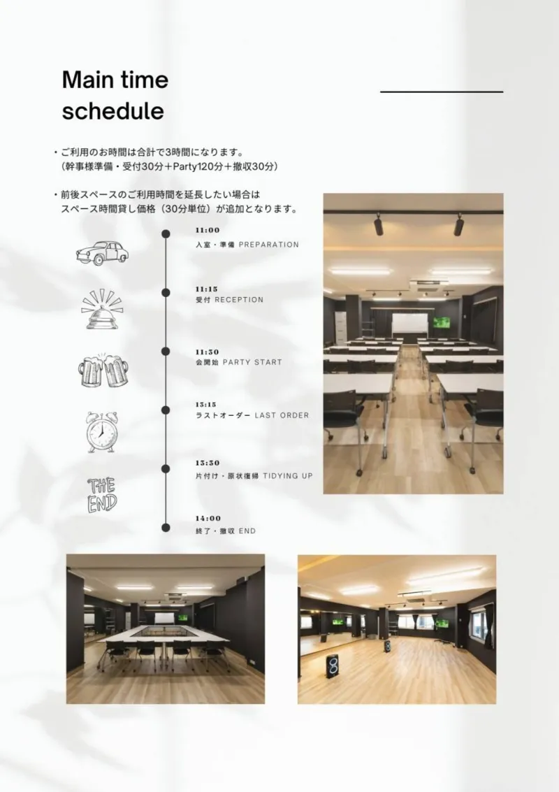 ❺ ご連絡無く延長利用された場合、別途請求させていただきます。入退室の時間は自動記録されていますので、ご利用時間をお守り下さい。(セッティング準備・家具配置・現状回復・片付けもご利用時間内です)