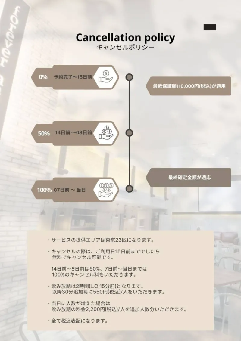 飲食可能ですが、その場合は、必ず「ゴミ処理オプション付メニュー」を選択してください。パーティーに便利な飲み放題付ケータリングサービスもご用意しています。